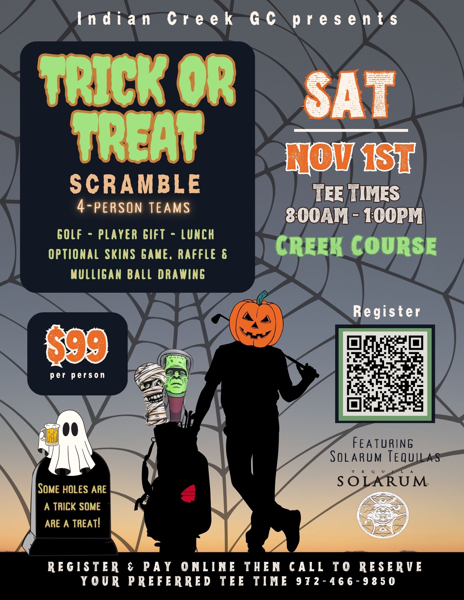 Trick or Treat Scramble | 4-person teams | $99/player | Our most popular event of the season! Golf, Player Gift, Lunch & Hole Contests, PLUS optional Skins Game & Raffle. | Some holes are a trick...and some are a treat!