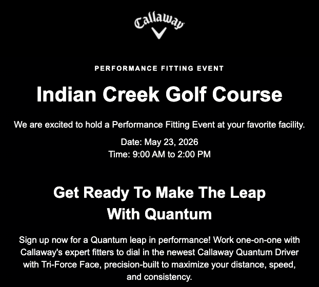 9 AM - 2 PM. Sign up now for a Quantum leap in performance! Work one-on-one with Callaway's expert fitters to dial in the newest Callaway Quantum Driver with Tri-Force Face, precision-built to maximize your distance, speed, and consistency.