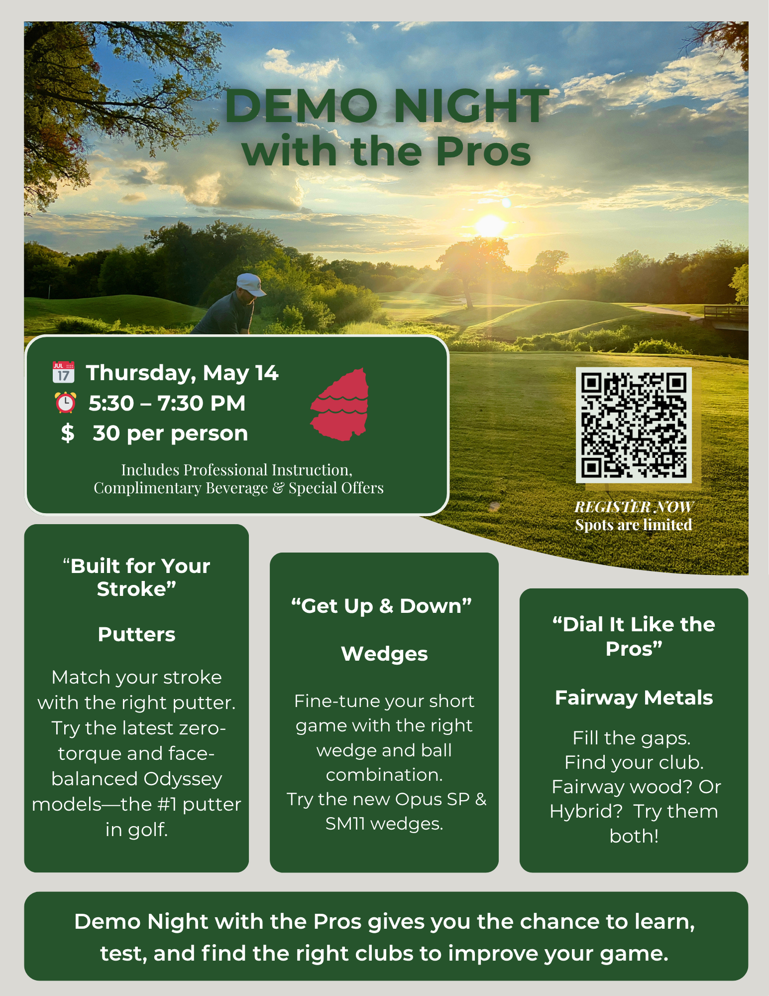 5:30-7:30pm | Thursday 5/14 | $30/person | Includes club demonstration from the Pros, a chance for you to swing, chip, putt with all new lines from both Callaway Golf and Titleist.